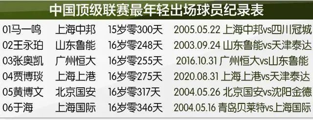 不过,这并不是本文所说的重点。尽管在比赛的最后时刻,广州恒大队派遣上了2001年龄段的王世龙替补出场,但这显然是一种“策略”而已,因为在这之前的一轮比赛中,恒大队同样将2001年龄段的谭凯元替换出场了。但是,上海上港队在4比1领先重庆当代之后,在第82分钟时用贾博琰换下阿瑙,却有着更为重要的意义,他是今年中超联赛中替补出场最年轻的本土球员,而且更是近些年来中国顶级联赛中最年轻的出场球员。