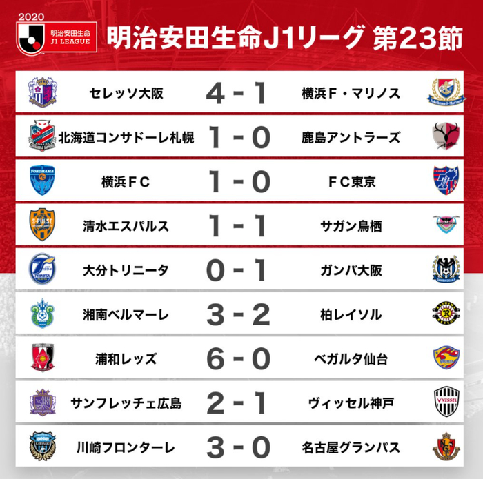 排名第二的大阪樱花主场4-1大胜横滨水手,近来发挥出色的前锋奥埜博亮打进2球并送出1次助攻。排在前几名的球队只有FC东京翻车掉队,他们客场0-1不敌横滨FC,他们在第88分钟被替补登场的草野侑己绝杀。