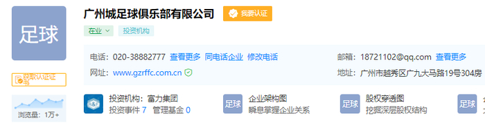 虎扑12月18日讯 此前有媒体报道,广州富力或将改名为“广州城”。据企业大数据平台“爱企查”上显示,广州富力足球俱乐部已更名为“广州城足球俱乐部有限公司”。