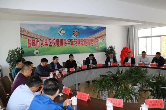 昨日,在盐城大丰区教育局举行了大丰权健青少年足球俱乐部揭牌仪式。出席揭牌仪式的领导、嘉宾有权健自然集团董事长束昱辉先生,权健集团陈汉权先生、邓飞先生,大丰区委常委、宣传部长石根美先生,大丰区体育局王国平局长,大丰区教育局副局长、区教师发展中心主任何钢,区教师发展中心副主任李德祥,足球俱乐部理事,基地学校的各位校长(园长)。