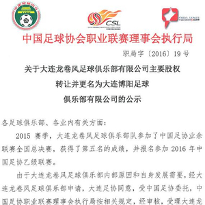 足协公示中乙大连龙卷风正式更名为大连博阳
