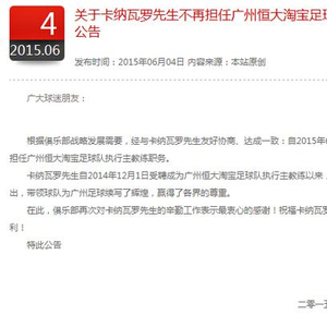 根据俱乐部战略发展需要,经与卡纳瓦罗先生友好协商、达成一致:自2015年6月5日起,卡纳瓦罗先生不再担任广州恒大淘宝足球队执行主教练职务。