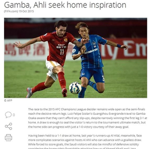 FIFA官网在前瞻本轮亚冠联赛时称,大阪钢巴和迪拜阿赫利力争在主场找到灵感。本轮比赛是决定性的,斯科拉里的广州恒大意识到,在大阪不能承受任何的闪失,尽管他们首回合主场勉强2-1取胜,一场平局就可以帮助恒大打进决赛,但主队只需要1-0就可以凭借客场进球优势晋级。