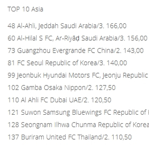 在亚洲俱乐部中,获得本赛季中超、亚冠双冠王的广州恒大排名世界第73位,是唯一一家跻身该榜单的中国俱乐部,落后于第48位的沙特吉达阿赫利与第60位的沙特希拉尔,位列亚洲第3。排名亚洲第4到第10的分别是FC首尔、全北现代、大阪钢巴、阿尔艾因、水原三星蓝翼、城南FC和武里南联。