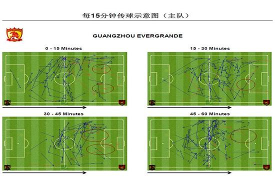 通过上图我们可以看到,在比赛的上半场,因为河北华夏幸福队的针对性部署,使得广州恒大淘宝队向华夏幸福队肋部的传球成功率很低,这一针对性防守部署在比赛的上半场是基本成功的。