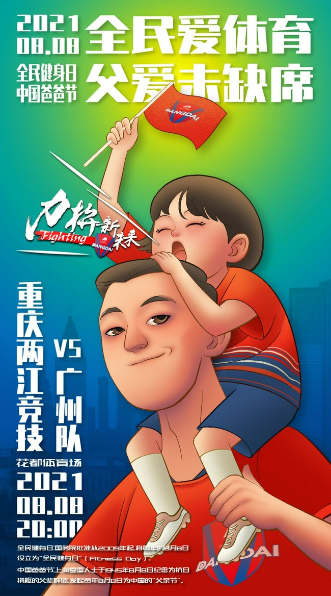 北京时间8月8日晚,重庆两江竞技队将在中超联赛第13轮迎战广州队。赛前,重庆两江竞技队发布了本场比赛海报——全民爱体育,父爱未缺席。