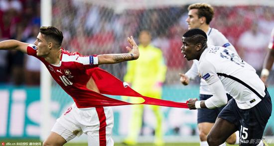不过,摔倒之后的博格巴丝毫没有调整,又加入到了与对方球员的拼抢中,只见他紧接着又跟对方的核心扎卡耗上了,一把抓住了后者的球衣并狠狠的拉拽了下去,这一下,扎卡的球衣硬生生的被博格巴撕下了一大块,露出了健硕的肌肉。