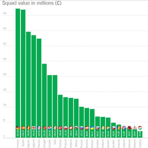 英格兰[微博]队和法国队分列第四、五名。而在榜单的另一端,最“便宜”的球队是匈牙利队,全队身价总和只有2049万英镑。