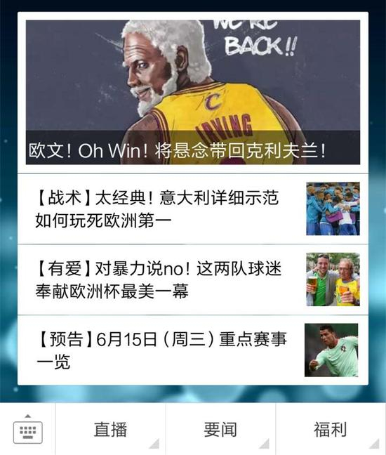 新浪体育微信公众号今日推送依然精彩不断:欧文!Oh Win!将悬念带回克利夫兰;对暴力说no,这两队球迷奉献欧洲杯最美一幕!更多精彩,尽在新浪体育微信公众号!