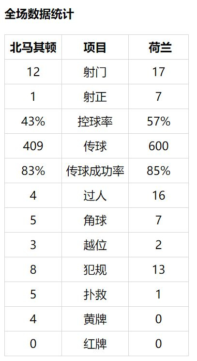 上半时两队各有6次射门,但北马其顿0射正。下半时,博赫海斯和廷伯出场,换下邓弗里斯和德弗赖。荷兰第51分钟扩大优势!博赫海斯左肋直传,德佩禁区左侧传中,维纳尔杜姆轻松左脚推射破门,2比0。