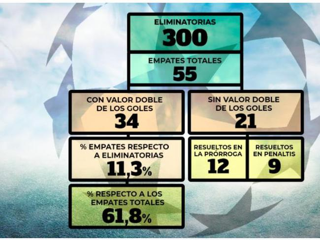在欧冠改制后,共进行了300次的两回合的淘汰赛,有55次双方两回合打成平手,其中34次依靠客场进球数决定胜负,避免了加时。