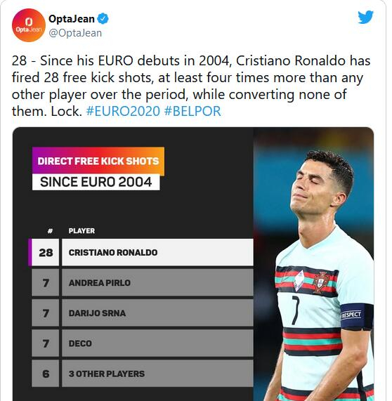 根据OPTA统计,自2004年首次参加欧洲杯以来,C罗在这一大赛舞台上已经主罚过28次直接任意球,至少是同期其他任何球员的4倍还多,但却没有一次破门。