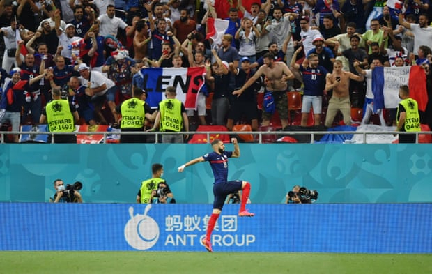 法国连入3球反超。第57分钟,格列兹曼和姆巴佩连续传球,本泽马巧妙停球后小禁区前捅射入网,1-1。第59分钟,格列兹曼同姆巴佩踢墙配合后小禁区左侧射门被索默勉强扑挡,本泽马近距离顶入空门,2-1。本泽马是普拉蒂尼之后首位在欧洲杯连场梅开二度的法国球员。第75分钟,本泽马禁区边缘外劲射被挡出,博格巴25码处射入右上角,3-1。他最近5次国家队进球均在禁区外打入。