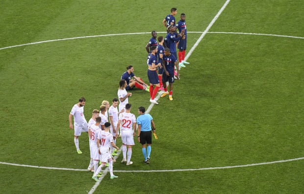 瑞士第55分钟错失良机,帕瓦尔禁区边缘内铲倒祖贝尔,主裁观看回放后判罚极刑,罗德里格斯主罚点球射左下角被洛里救出。博格巴斜传,姆巴佩禁区左侧12码处射远角稍稍偏出。