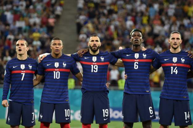 法国(3-4-3):1-洛里;4-瓦拉内,5-朗格莱(46',20-科曼)(111',26-图拉姆),3-金彭贝;2-帕瓦尔,6-博格巴,13-坎特,14-拉比奥特;19-本泽马(94',9-吉鲁),7-格列兹曼(88',17-西索科),10-姆巴佩