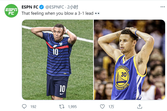 好事的ESPN在赛后,直接把罚丢点球的姆巴佩和2016年在NBA总决赛上3-1领先却错失总冠军的库里相提并论。
