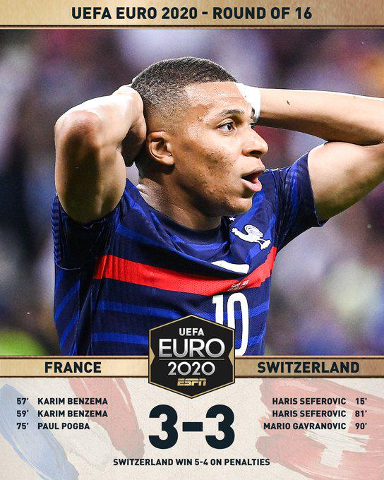 在30分钟互交白卷的加时赛后,双方前9粒点球全都有惊无险的命中目标,最后一个出场,顶着巨大压力走上点球点的姆巴佩的劲射被门将索默单手扑出,瑞士队完成了神奇的1-3大逆转。