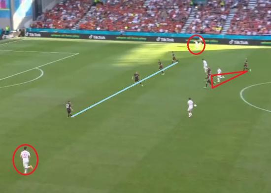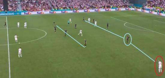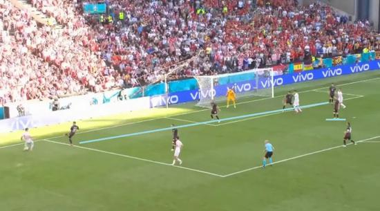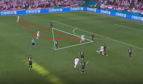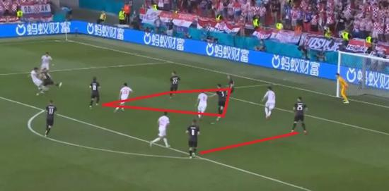 从图中可以很轻松地发现,四后卫分别在防传中、站前点、中点、后点,而除了他们之外,克罗地亚只有一名多余的防守球员,能在中路给后卫们做些帮衬。