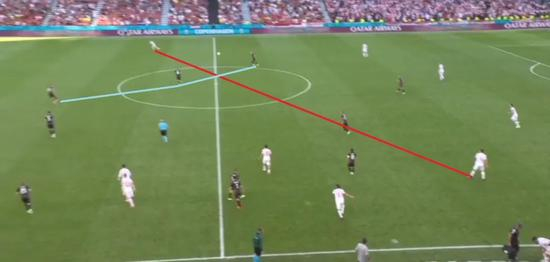 在这个时候,他们敏锐地抓住了克罗地亚注意力不集中、体能下滑、阵型扩大的破绽,由保-托雷斯发起斜对角的跨场长传,找到了右路插上的费兰-托雷斯。