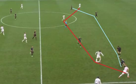 首先,是科克和萨拉维亚在前场进行踢墙式二过一配合,右路的萨拉维亚切入中路,吸引到了布罗佐维奇、格瓦迪奥尔和卡莱塔-卡尔三人的注意力。