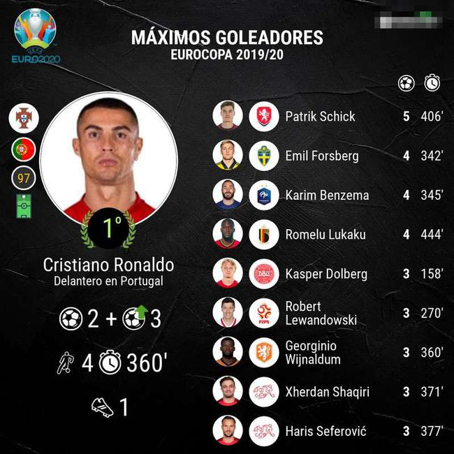 同样打入5球的还有捷克的希克,不过因为助攻比C罗少1次,他排在了第二位。