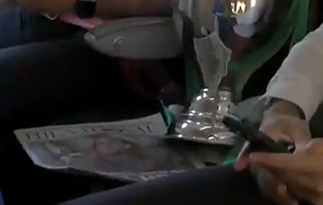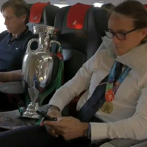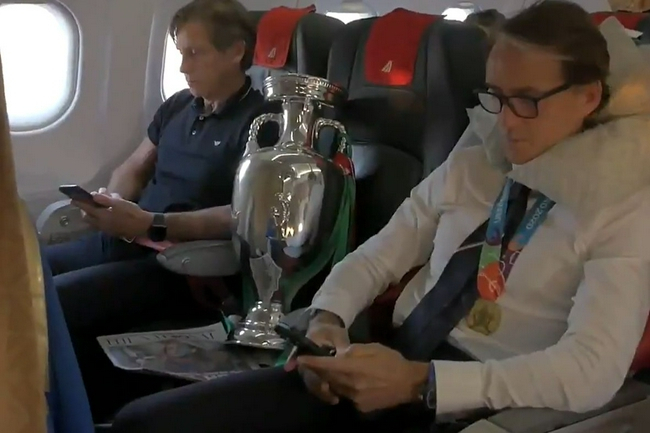 意大利队官方发布了一段球队携带德劳内杯回国的视频,“细心”的苏格兰记者从中找到了亮点,在飞机上,赛前求曼奇尼率队夺冠的苏格兰报纸,赫然压在曼奇尼邻座的奖杯下面。