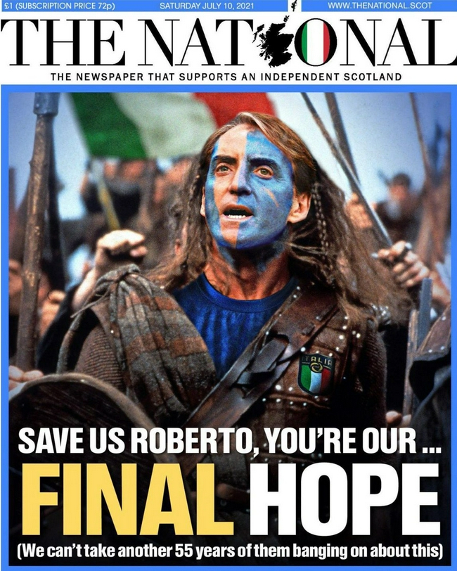 这份支持苏格兰独立的报纸,在赛前一期头版上,将电影《勇敢的心》男主角华莱士替换成了曼奇尼,头版标题写道:“救救我们,罗伯托,你是我们最后的希望。我们无法再忍受他们显摆这个55年。”