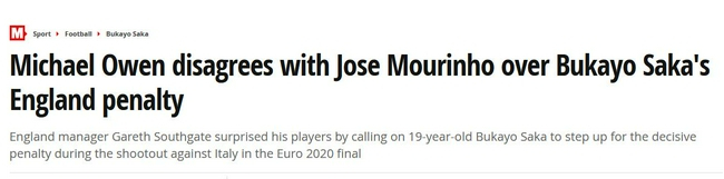 穆里尼奥等人称,让19岁的萨卡主罚关键点球,给他的压力太大,但英格兰名宿欧文在社交平台反驳称,这是胡说。