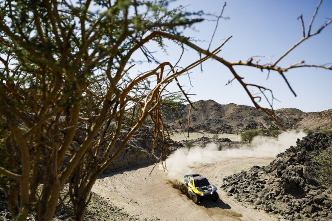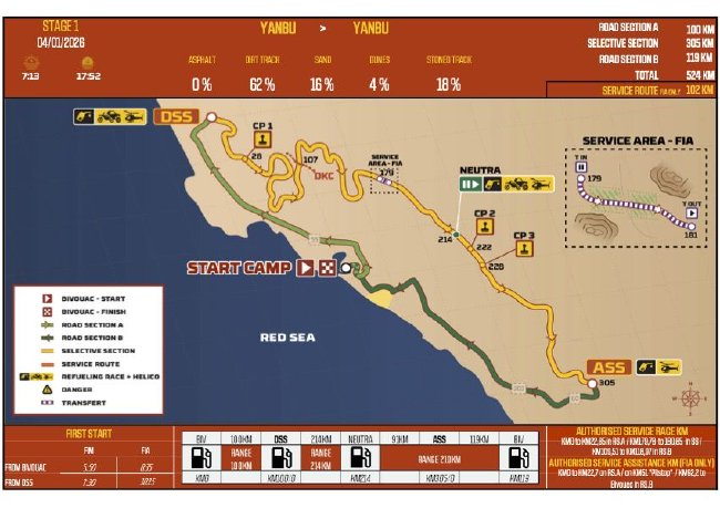 第二比赛日车手们终于迎来了真正意义上的第一赛段。今天第一赛段共524km,从延布出发最终返回延布,其中计时赛段长305km。赛段由两段风格迥异的地形构成;在赛程前半段车手们将会在岩石阵中穿行,来到后半段将会面对相较笔直,车速较快的路段。但在后半段的赛程中布满了小沙丘。