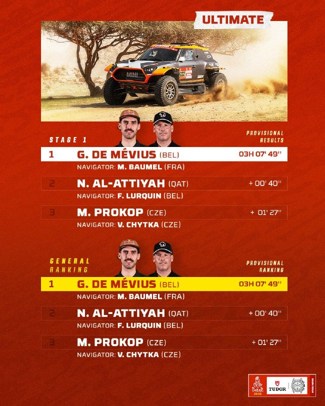 X-RAID车队比利时车手德·梅维乌斯(Guillaume De Mévius)在GPS系统出现问题的情况下,通过自己最后一个计时段的优异表现获得了这一赛段汽车组冠军,也让自己以微弱优势来到总成绩第一名。