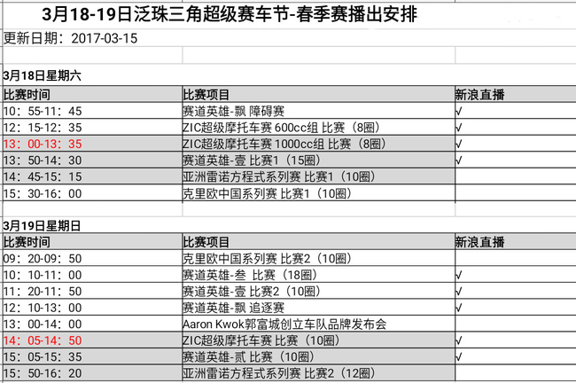 2017年泛珠三角超级赛车节春季赛赛程表: