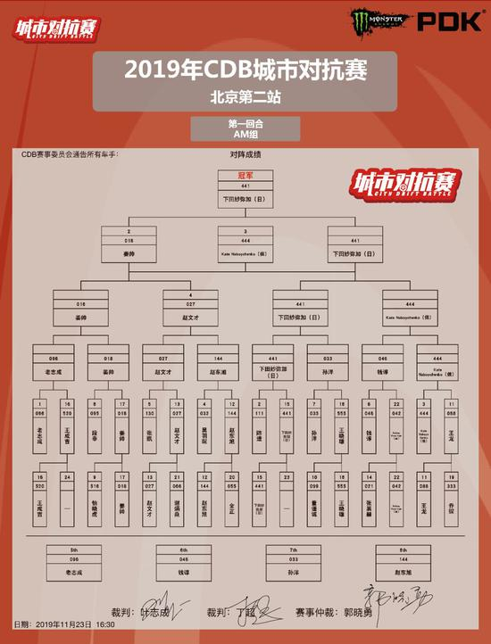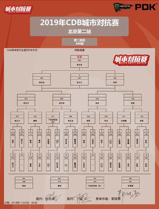 第二回合AM组4进2的半决赛,096号车手老志成和027号车手赵文才的对决非常精彩,两人跟飘门对门复刻般的领飘线路,让两位裁判发出了ONE MORE TIME的指令!第二回合赵文才追走出现失误调头,老志成获胜决赛!