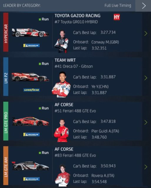 丰田7号车组拿下勒芒四连冠及Hypercar组别冠军,LMP2组别冠军是Team WRT车队的31号车,GTE PRO和GTE AM组别冠军则分别由法拉利车队的51号和83号车组获得。而在本赛季新设的LMP2 Pro-Am组别中,DragonSpeed USA车队的21号车组拿到冠军。