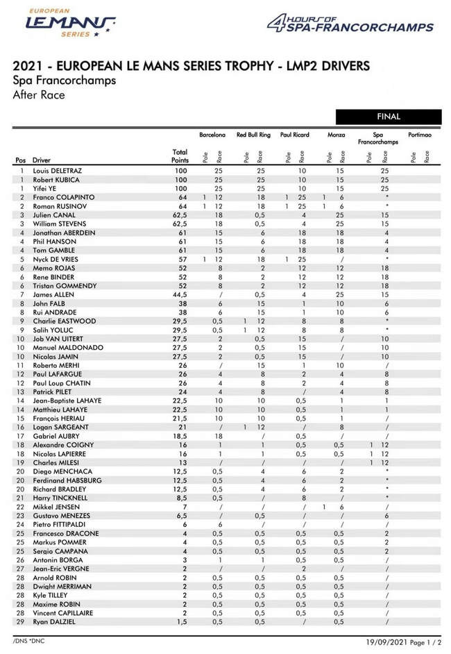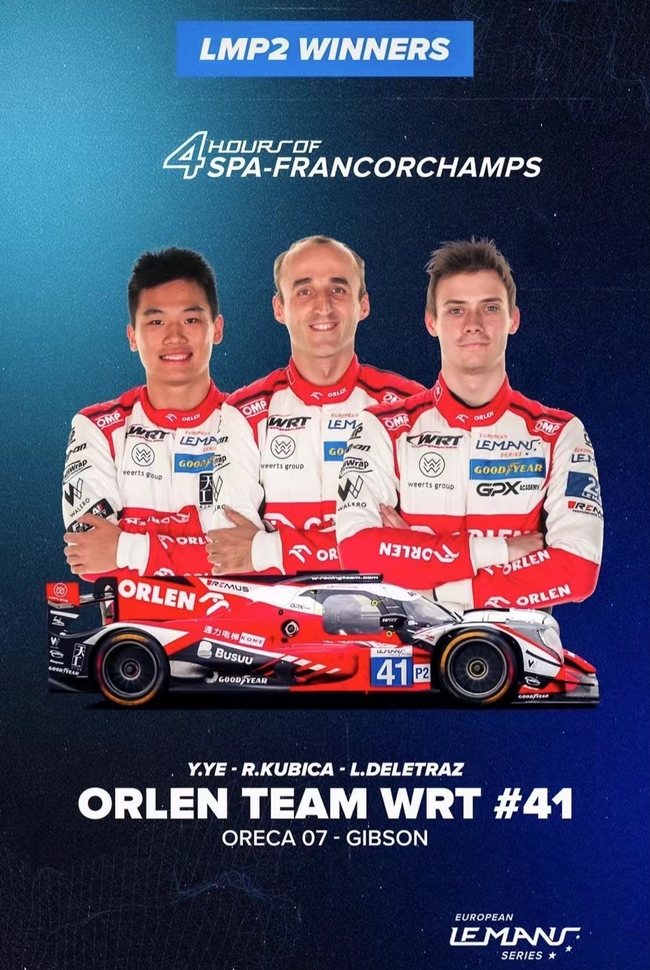 叶一飞所在的WRT#41车队在LMP2组别中的领先地位无可争议,他们在本赛季到目前为止的五场比赛中获得了三场冠军。WRT车队的冠军有很多“第一次”:比利时车队第一次获得ELMS总冠军,而对于首次亮相的LMP2组别车队来说,也是前F1车手库比卡和中国车手叶一飞第一次获得总冠军。叶一飞更是成为了首位在单赛季中同时拿下亚洲和欧洲勒芒年度总冠军的车手,也是第一位获得欧洲勒芒总冠军的亚洲车手。