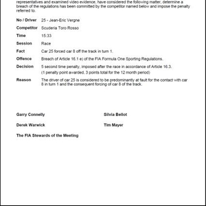 “25号赛车的车手,在1号弯与8号赛车接触的过程中负有主要责任,其结果是将8号赛车逼出了赛道。按照F1运动规则16.3条规定,对其比赛成绩加罚5秒,同时超级驾照扣1分。”F1美国站的干事在官方声明中写道。