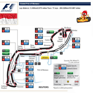 “这是一条一点错误都不能有的赛道,”舒马赫指出:“对赛车的调教必须十分小心,以应付赛道的每一种特点。我的经验是稳定性在摩纳哥是最为重要的一个方面。”驾驭马力强大的F1赛车78次穿越狭窄的街道完成这站比赛对车手来说确实是一次充满刺激的挑战。难怪有人将摩纳哥大奖赛称为F1“王冠上的明珠”,在这里夺得冠军的车手无意中也会被车迷们“看高”一个档次。