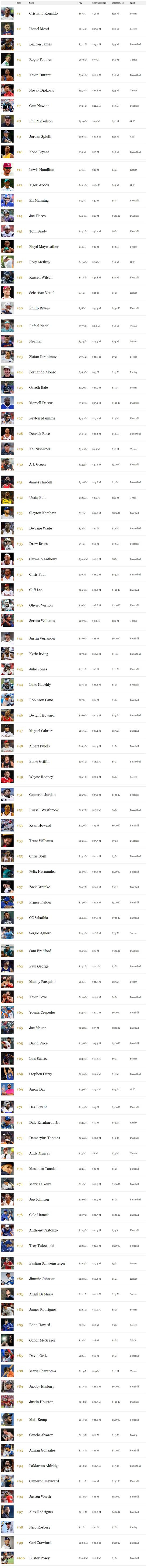 排行榜中名列榜首的是葡萄牙足球球星克里斯蒂亚诺-罗纳尔多,收入共8800万美元,其中包括5600万美元的薪水,以及3200万美元的广告收入。去年收入最多的美国拳击运动员弗洛伊德-梅威瑟今年的收入只有3200万美元排在第16。
