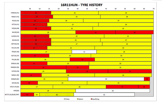 匈牙利的三款轮胎是软胎、软胎和中性胎。倍耐力表示两停是最快的策略,分配用超软胎起跑,在后两节用软胎。如果想尝试与众不同,用软胎-超软胎-超软胎的组合,则需要车手至少能够用超软胎坚持20圈,负荷相当之大。不过可以肯定的是,任何包含中性胎的策略都没啥竞争力。不过也不排除想守住赛道位置的车手,可以用它试试看。