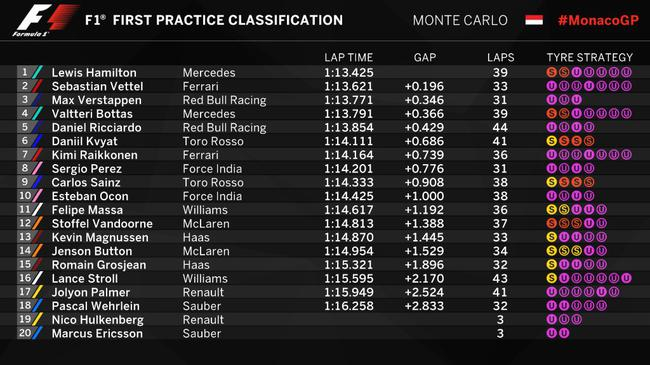 5月25日下午,2017年F1摩纳哥大奖赛第1次练习赛在蒙特卡洛赛道结束。梅赛德斯车队汉密尔顿1分13秒425飚出最快圈速,法拉利车队维特尔落后0.196秒第二,红牛车队维斯塔潘使用全新T型翼赛车跑出了第三快的圈速。本站比赛顶替阿隆索出战的巴顿以1分14秒954的成绩位居第14位。