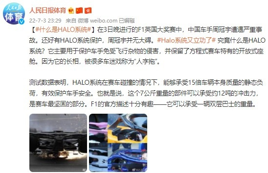 3日晚进行的F1英国大奖赛中,中国车手周冠宇遭遇严重事故。还好有HALO系统保护,周冠宇并无大碍。