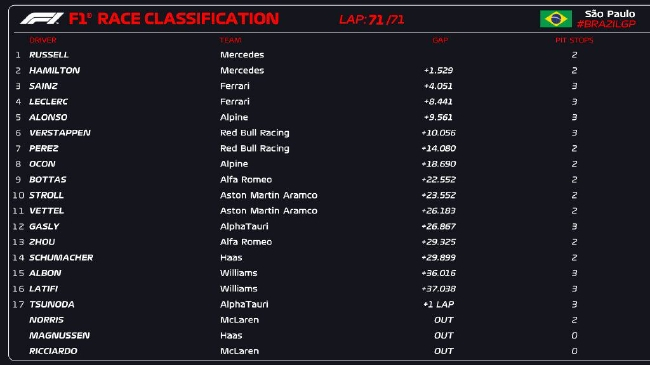F1圣保罗大奖赛:拉塞尔夺生涯首冠 周冠宇第12