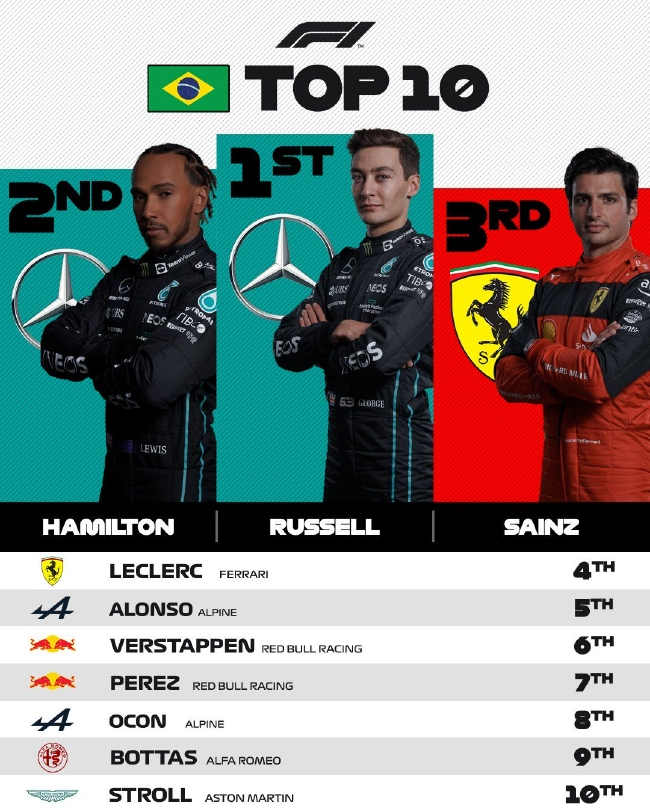 2022年F1圣保罗大奖赛周日正赛,拉塞尔帮助车队拿到赛季首个分站冠军!汉密尔顿亚军,梅赛德斯车队两个赛季以来首次一二带回!塞恩斯拿到季军!