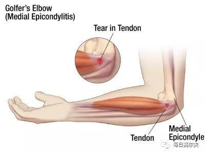 高尔夫球肘又称肱骨内上髁炎或屈肌总腱损伤。为旋前屈肌群肌腱起始部过度疲劳而引起的损伤。当打高尔夫球后摆到最高点时,此部肌肉处于外翻的压力之下,该压力贯穿下摆的整个过程中直至撞击到高尔夫球。