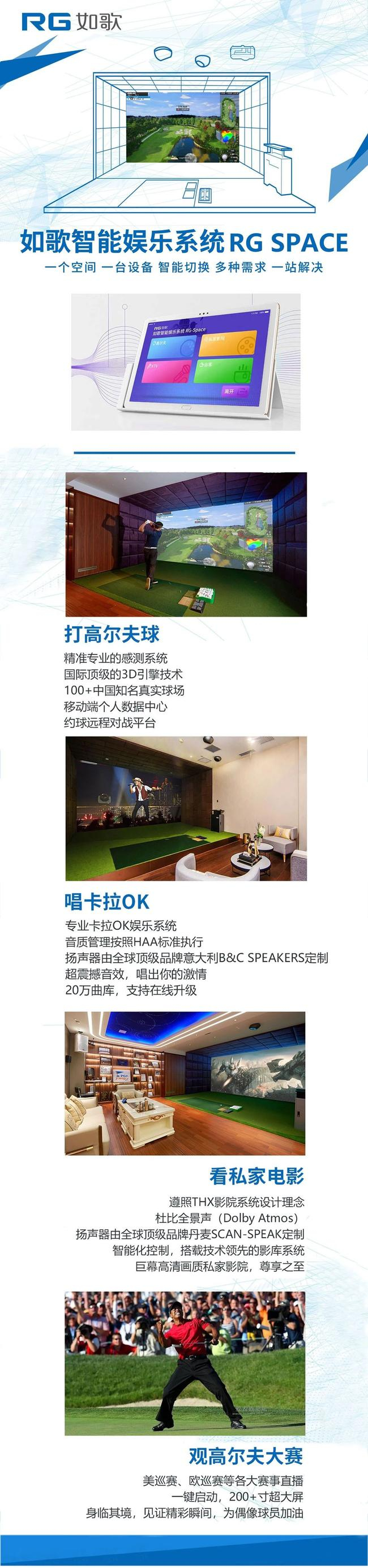 如歌智能娱乐系统(RG SPACE)打造的智能娱乐空间满足了打高尔夫、观高尔夫大赛、看私家影院、唱卡拉OK、开远程会议、看超级电视、灯光环境调节等七大需求。在同一空间里,多项功能完美结合并全部智能控制,提高客户私家空间的利用率的同时让客户体验到随心切换和视、听、体、感交汇的至尊享受,满足你足不出户K歌看大片的娱乐需求。