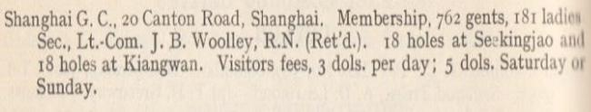1937年,上海高尔夫俱乐部的地址是广东路20号,会员762位男士,181为女士。秘书长为退休海军少校J.B。 武列(Woolley)。下设泗泾桥18洞和江湾18洞球场。客人打球每天收费3元;周六周日5元。