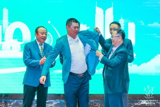为了感谢承办球会,俱乐部年会有一个传统:为承办球会经理人颁发印有会徽的绿夹克。开幕当晚,喻湘闽先生为湖州温泉高尔夫俱乐部总经理严东海先生披上了胜利与传统的绿夹克,将这一传统继续发扬!