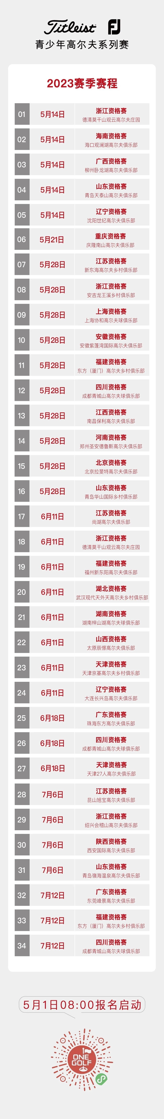 Titleist FJ青少年高尔夫系列赛第一阶段赛事——省级赛区资格赛将于5月在全国20个省市的30个球场陆续展开。赛事报名通道将于5月1日8点正式开启,选手们可以通过“ONEGOLF 壹高尔夫”微信小程序进行报名。