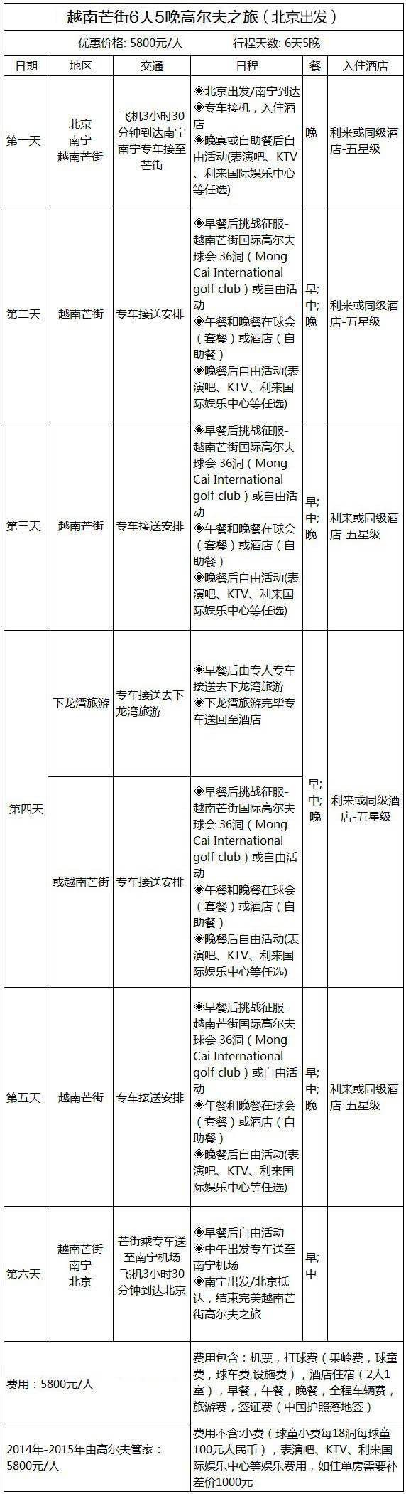 含:机票、住宿(5星级、双人入住、单房补差1000元)、含车无限畅打、越南餐费、下龙湾旅游、签证费、全程交通费。