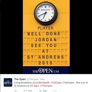 而在英国公开赛[微博]刚刚开通的新浪微博上,同样标上了这张图片,并祝贺道:“恭喜乔丹·斯皮思赢得美国公开赛冠军。25天后,圣安德鲁斯见。”