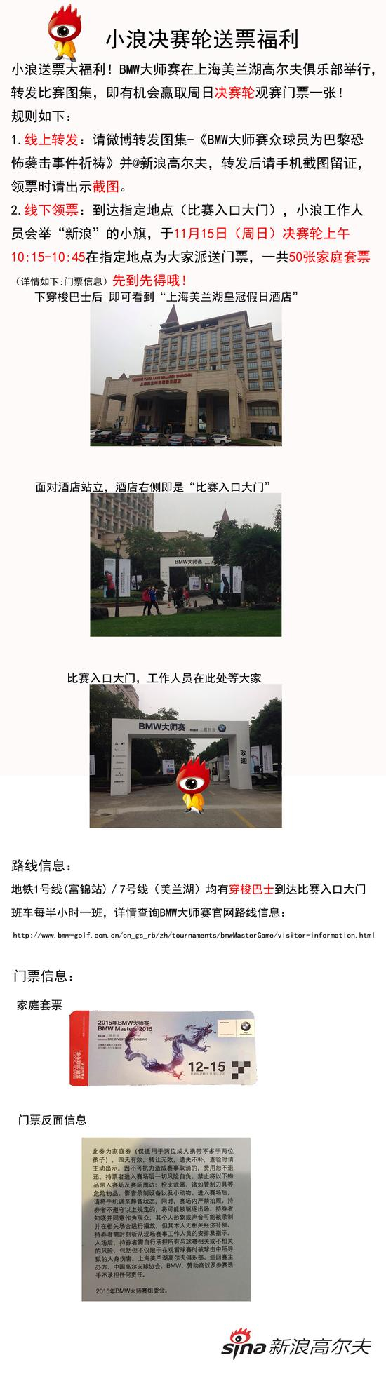 详细领票规则请看下图,地铁1号/7号线有穿梭巴士往来球场,穿梭巴士信息请查询官网:http://www.bmw-golf.com.cn/cn_gs_rb/zh/tournaments/bmwMasterGame/visitor-information.html